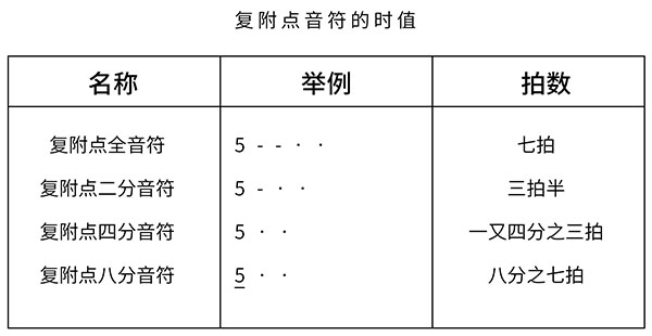 复附点音符写法是在附点音符右边再加一个点,这一点叫做复附点。复附点的时值,等于附点音符的附点的一半。比如在四分音符的右边加上复附点。如5..,它的时值就有一拍又四分之三。如下表:
